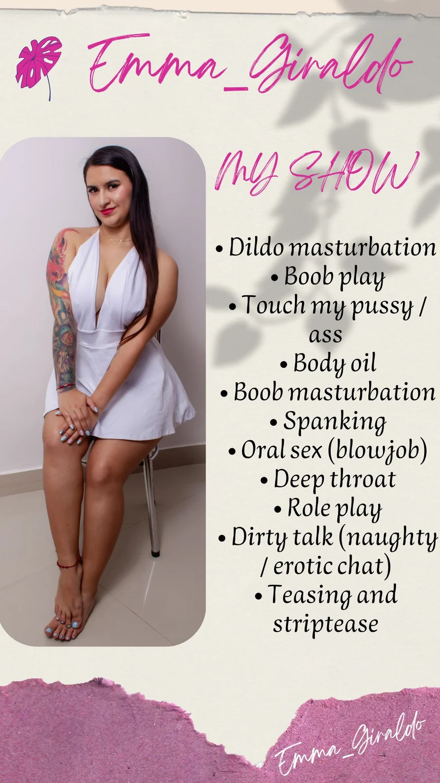 Doggy Style, Striptease, Facial, Blowjob, Masturbation, Cowgirl, Cooking, Shower, Spanking, Fingering, Foot Fetish, Humiliation, Tittyfuck, Handjob, Oil Show, Creampie, Erotic Dance, Dildo or Vibrator, Deepthroat, Role Play, Orgasm, Topless, Heels, Twerk, Squirt, Hardcore