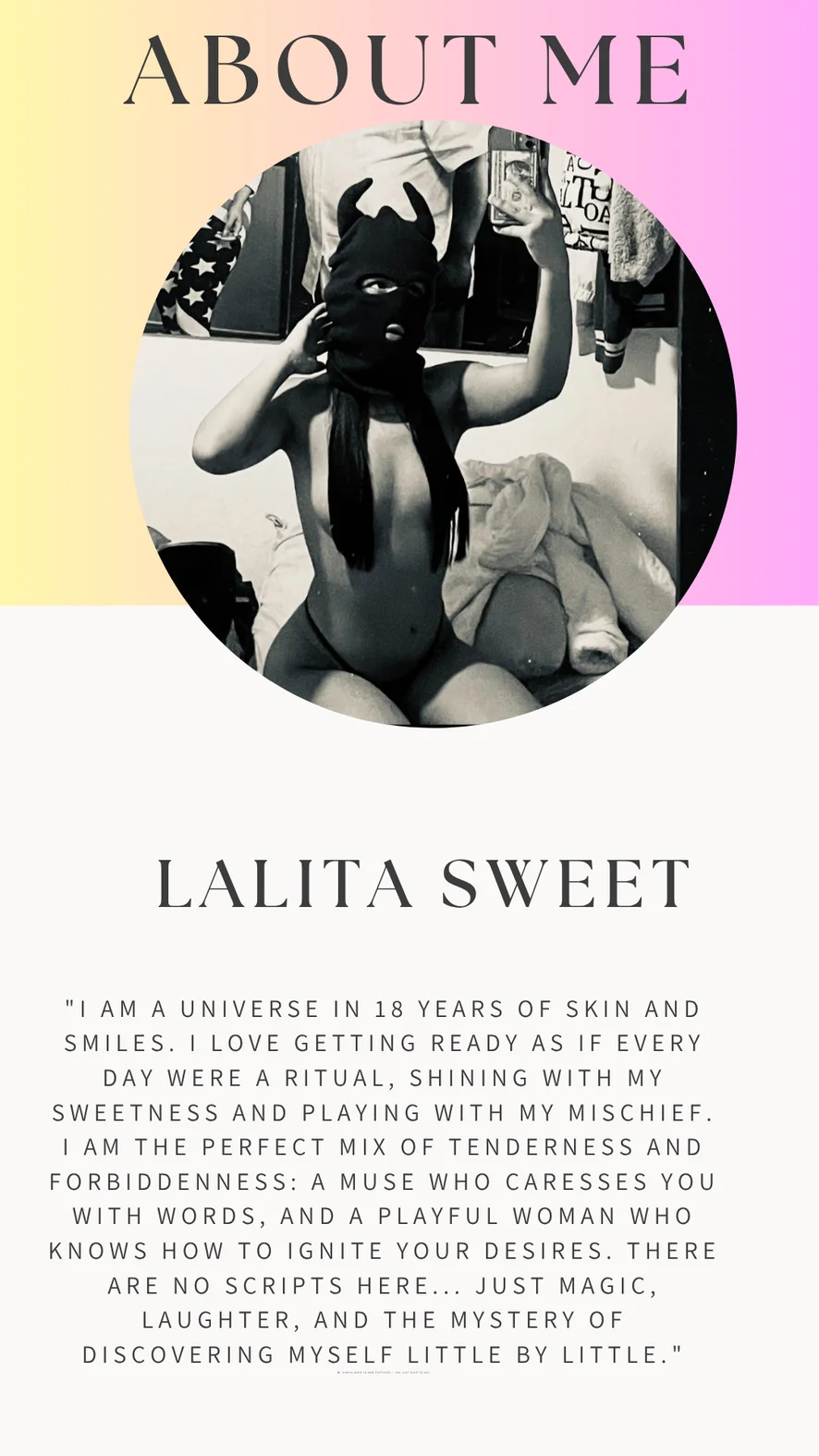 "I am a universe in 18 years of skin and smiles. I love getting ready as if every day were a ritual, shining with my sweetness and playing with my mischief. I am the perfect mix of tenderness and forbiddenness: a muse who caresses you with words, and a playful woman who knows how to ignite your desires. There are no scripts here... just magic, laughter, and the mystery of discovering myself little by little."