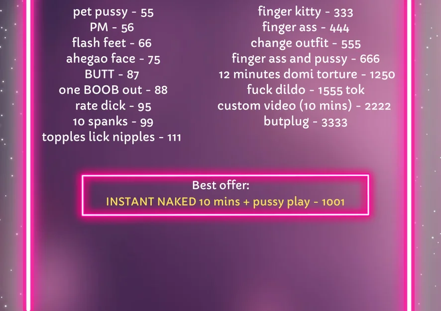Anal, Squirt, Topless, Fingering, Striptease, Masturbation, Doggy Style, Shower, Twerk, Sex Toys, Oil Show, Dildo or Vibrator